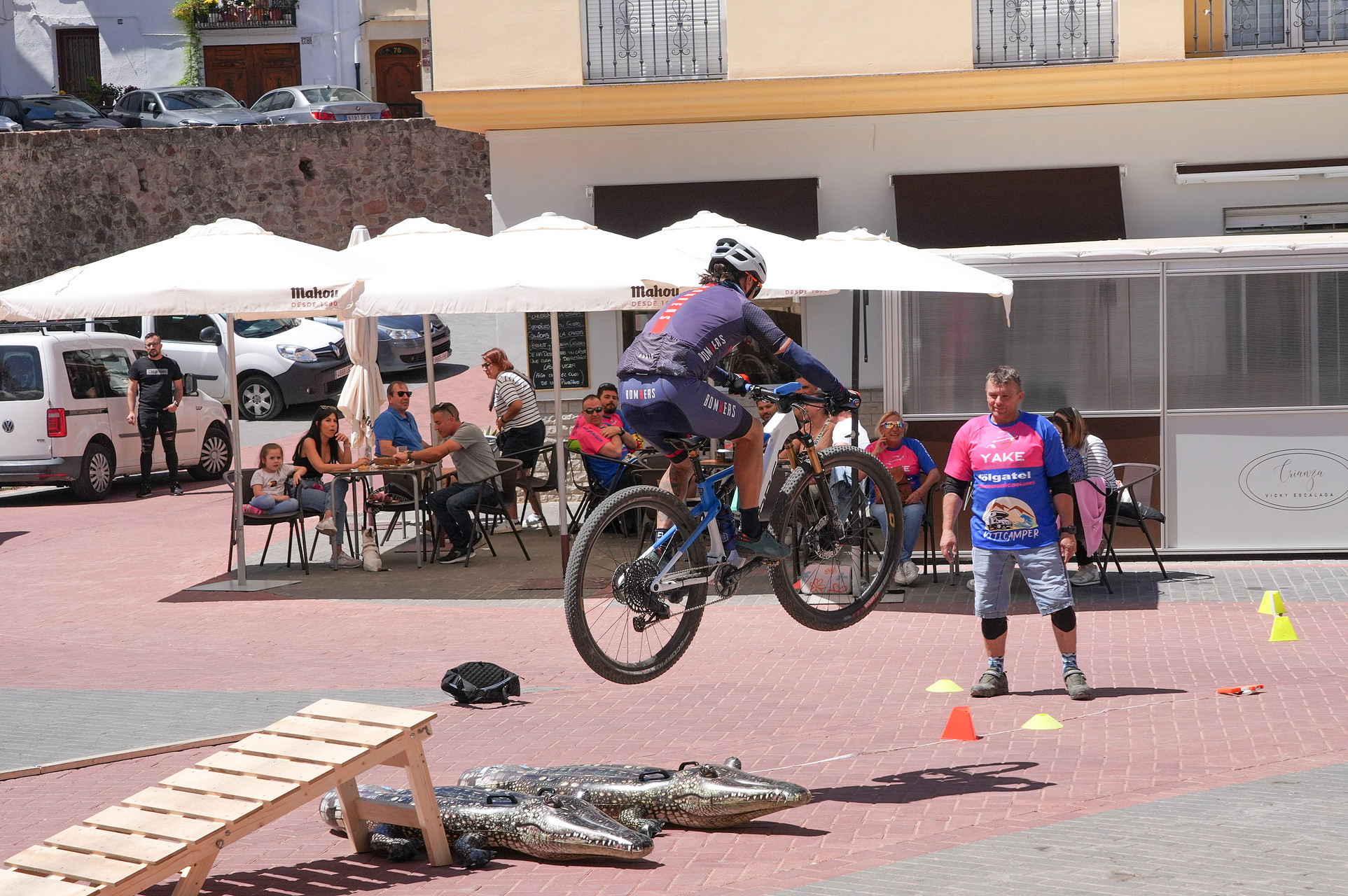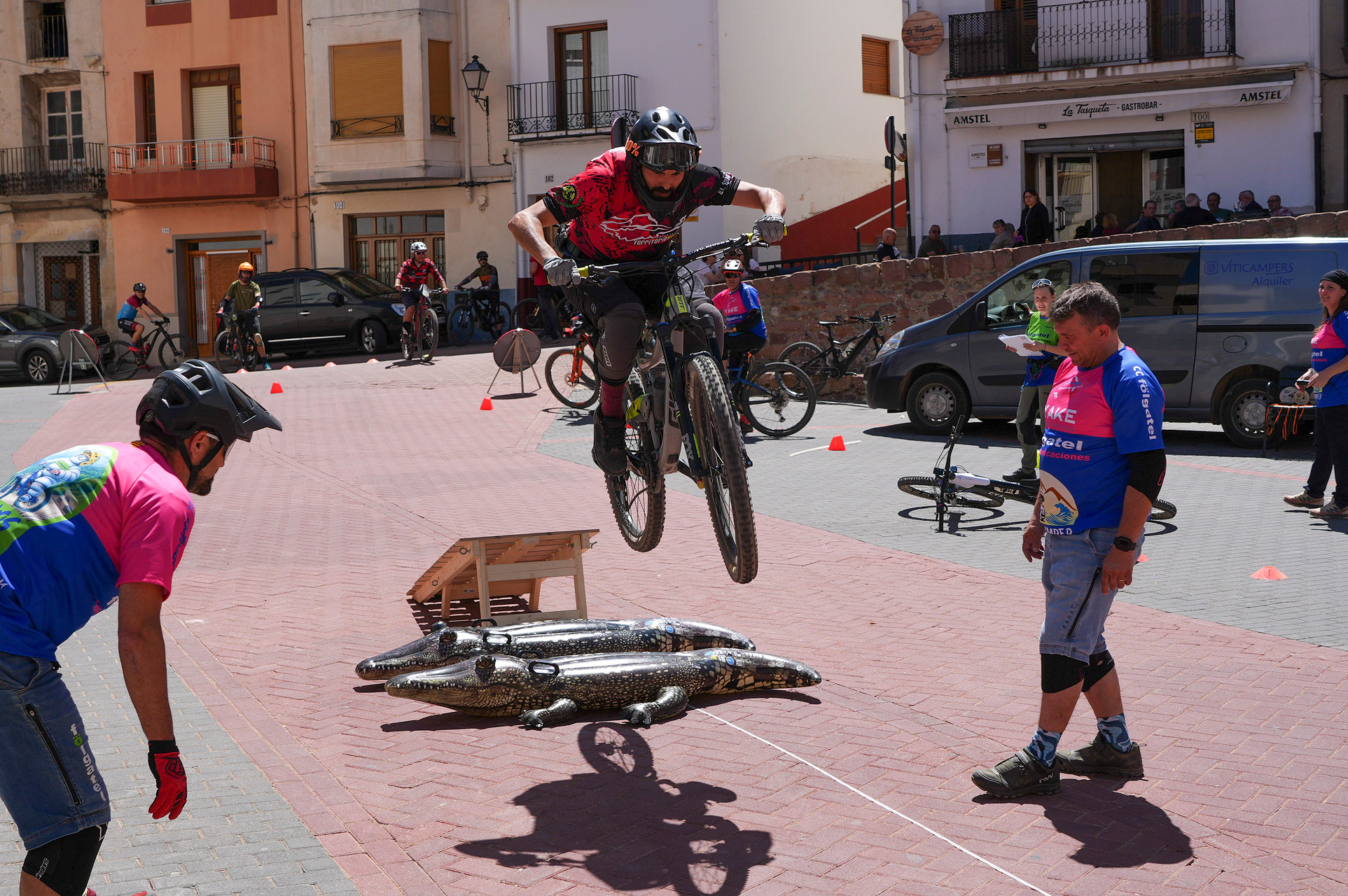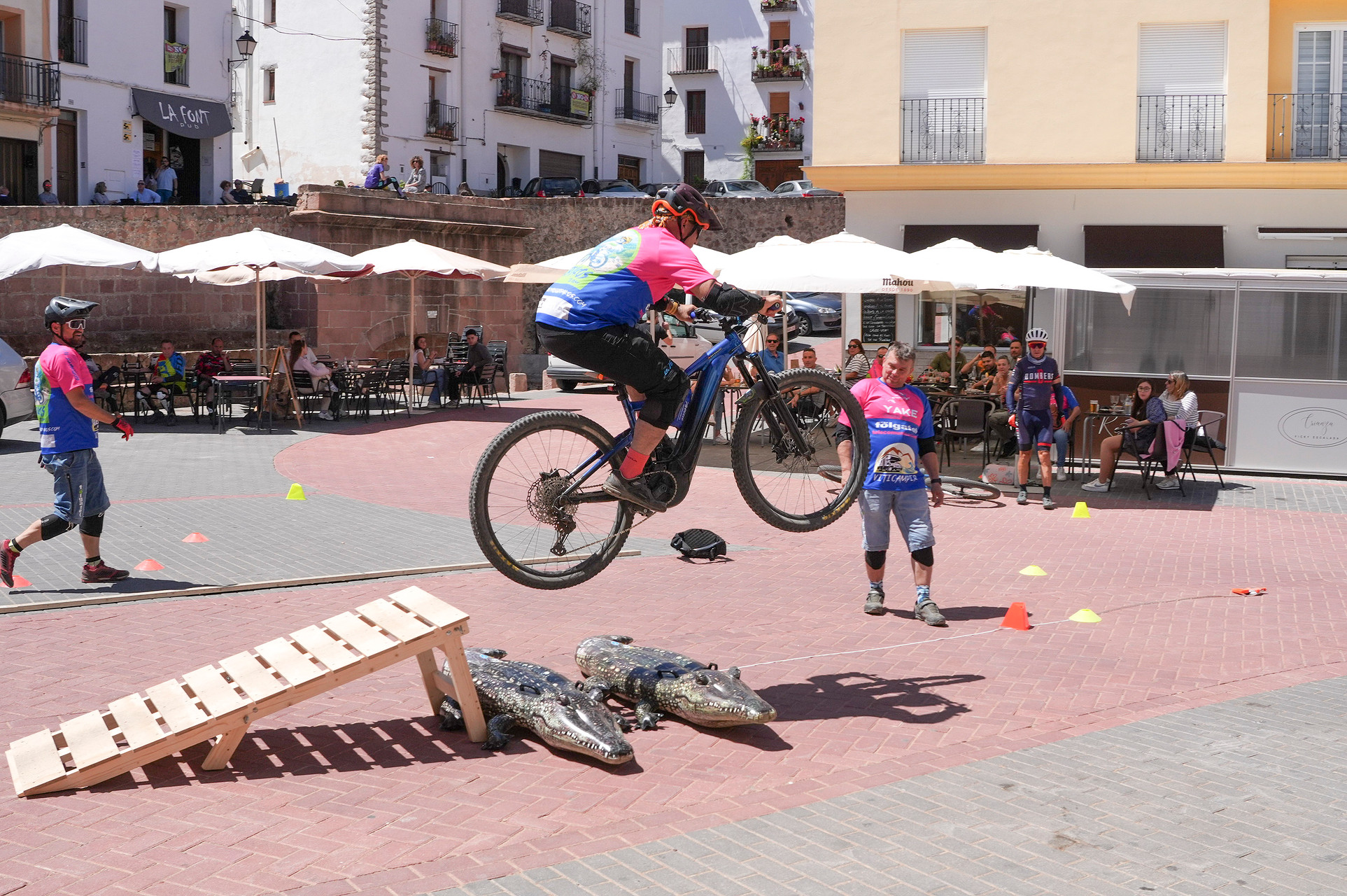Finalización de la Ruta y Competición: Al concluir la ruta, descendimos por las escaleras del pueblo, que nos llevaron directamente a la plaza principal, donde el Ayuntamiento nos reservó un espacio para una emocionante minicompetición y exhibición de saltos, demostrando nuestras habilidades y compartiendo la pasión por el ciclismo de montaña.Acompañados de un excelente fotografo que inmortalizo los mejores momentos. Asi como la entrega de trofeos que teniamos preparada para los mas habiles en esta ocasion el ganador fue Xela por partida doble tanto en el salto que arraso con una distancia de mas de 5 metros y la minicompeti que la termino en menos de un minuto. Un crack jejeje