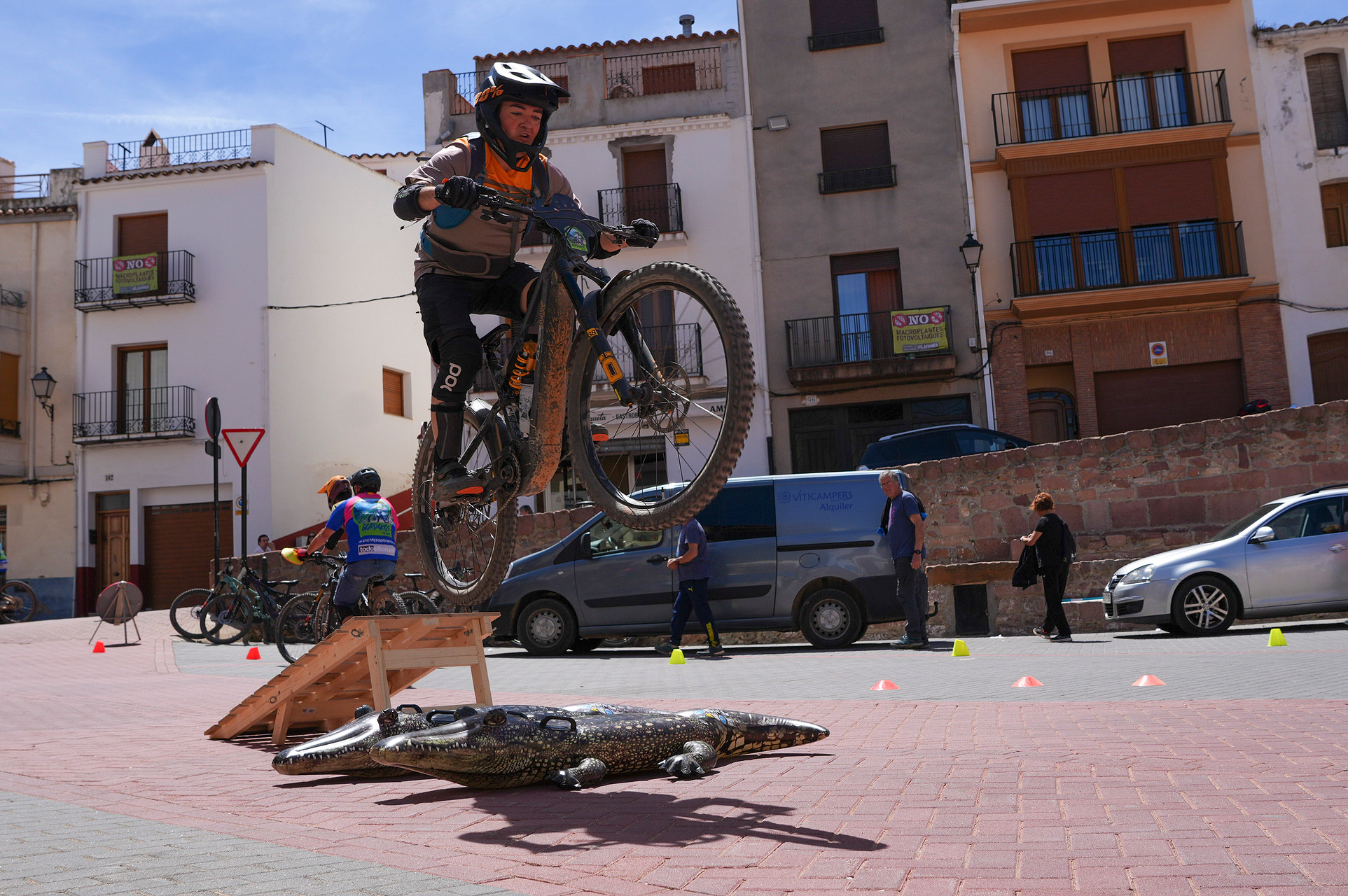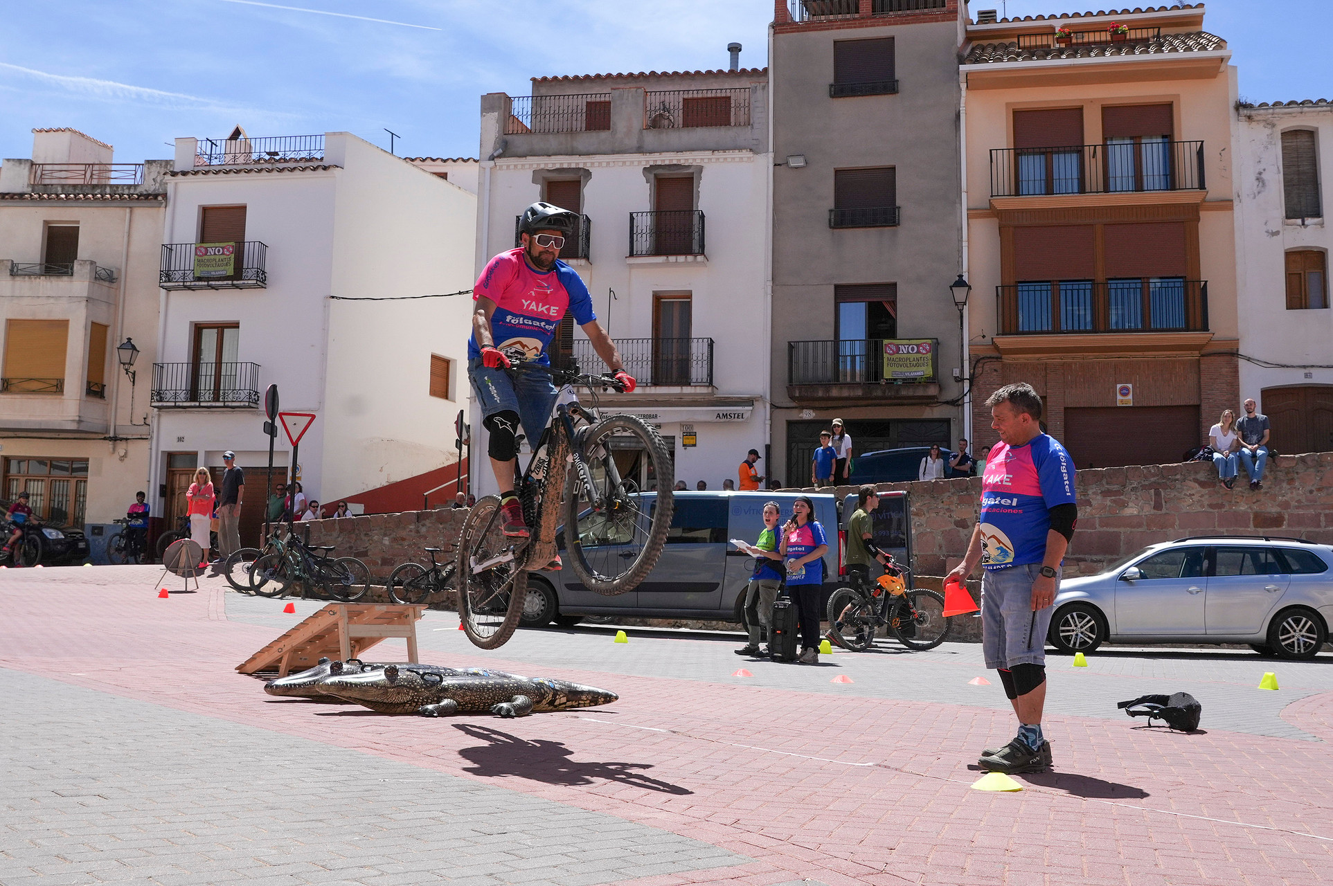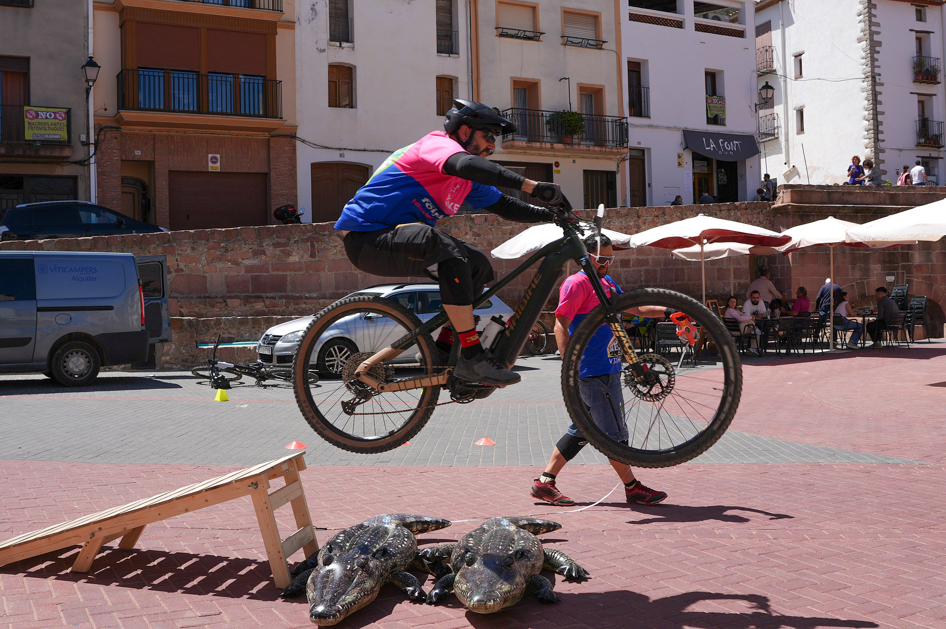 Finalización de la Ruta y Competición: Al concluir la ruta, descendimos por las escaleras del pueblo, que nos llevaron directamente a la plaza principal, donde el Ayuntamiento nos reservó un espacio para una emocionante minicompetición y exhibición de saltos, demostrando nuestras habilidades y compartiendo la pasión por el ciclismo de montaña.Acompañados de un excelente fotografo que inmortalizo los mejores momentos. Asi como la entrega de trofeos que teniamos preparada para los mas habiles en esta ocasion el ganador fue Xela por partida doble tanto en el salto que arraso con una distancia de mas de 5 metros y la minicompeti que la termino en menos de un minuto. Un crack jejeje